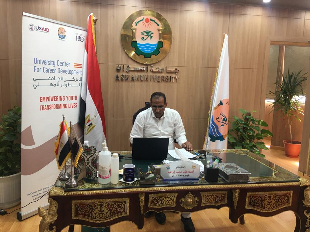 Aswan University President Prof. Ahmed Ghallab Mohamed declared that within the framework of training students and working to refine their talents, and linking them to the labor market and its needs, the University Center for Career Development at Aswan University announces launching the first virtual employment platform for 2021 under patronage of the Minister of Higher Education and Scientific Research Dr. Khaled Abdel-Ghaffar, and in cooperation with nine presidents of other universities.
