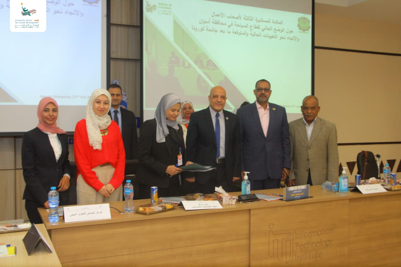 Prof. Ayman Mahmoud Othman-Acting of Aswan University President stressed the importance of three sectors of the university: education and scientific research-social service-environmental development; pointing out that the university through the University Center for Professional Development implemented the events of the round table under the title of the current situation of the tourism sector in Aswan Governorate and future trends in order to discuss the repercussions of Coronavirus pandemic, and working on finding the mechanisms of working and employment post corona in the tourism sector and links the graduates with the labor market, and works on providing jobs opportunities to our students and graduates to keep pace with developments to be qualified for always keeping pace with labor market.