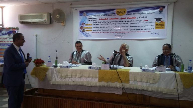 The Discussion committee granted the researcher a master’s degree with distinction, with the circulation of the thesis with various educational institutions, the thesis under supervision of Prof. Ahmed Kamel Al-Rashidi – Professor of Fundamentals of Education, and Prof. Ahmed Sayed Khalil_ may Allaa have mercy on him – Vice President of the University for Environmental Affairs and Community Service and Dr. Sahar Khalil – lecturer of Fundamentals of Education.