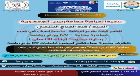 In implementation of the initiative of His Excellency the President of the Republic, Mr. Abdel Fattah El-Sisi, in light of the Bidaya Initiative (A New Beginning for Building the Human Being), the Faculty of Sports Sciences – Aswan University, under the auspices of both Prof. Dr. Loay Saad El-Din – President of the University and Prof. Adel Mohamed Abdel Moneim Mekki – Dean of the Faculty of Sports Sciences, is organizing, within the activities of 100 Sports Days, entitled “Building a Strong Generation Capable of Facing the Challenges of the Future” on Wednesday, November 20, 2024, at 11:00 am, at the faculty playgrounds and Marshal Tantawi Hall, Aswan University, Sahary.