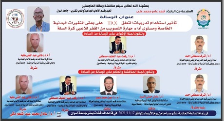 The master’s degree submitted by the researcher / Ahmed Amer Muhammad Ali will be discussed under the title “The effect of using Total Resistance Exercises ( TRX) on some special physical variables and the level of performance of the shooting skill from the wilderness of basketball players”