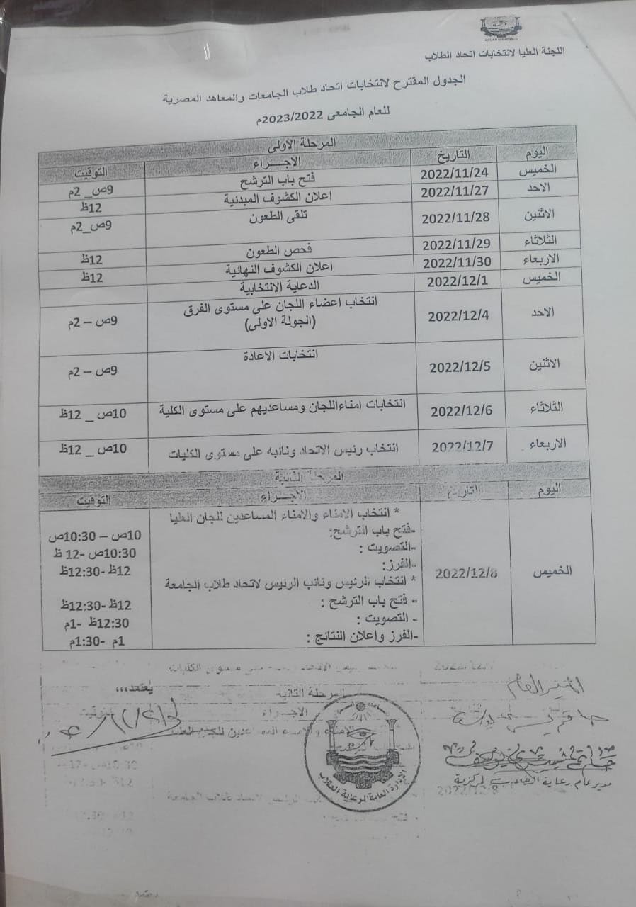 The Suggested Schedule for Student Union Elections for the Academic Year 2022/2023