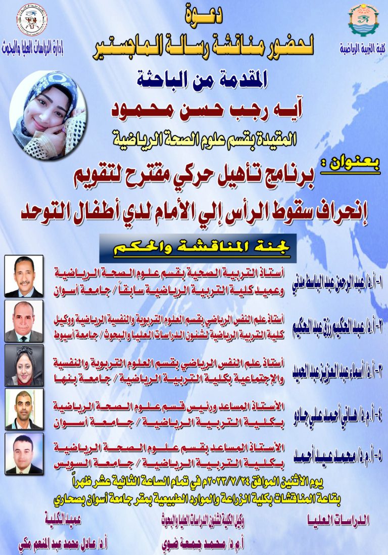 سيتم مناقشة رسالة الماجستير المقدمة من الباحثة /آية رجب حسن محمود بعنوان ” برنامج تاهيل حركى مقترح لتقويم إنحراف...
