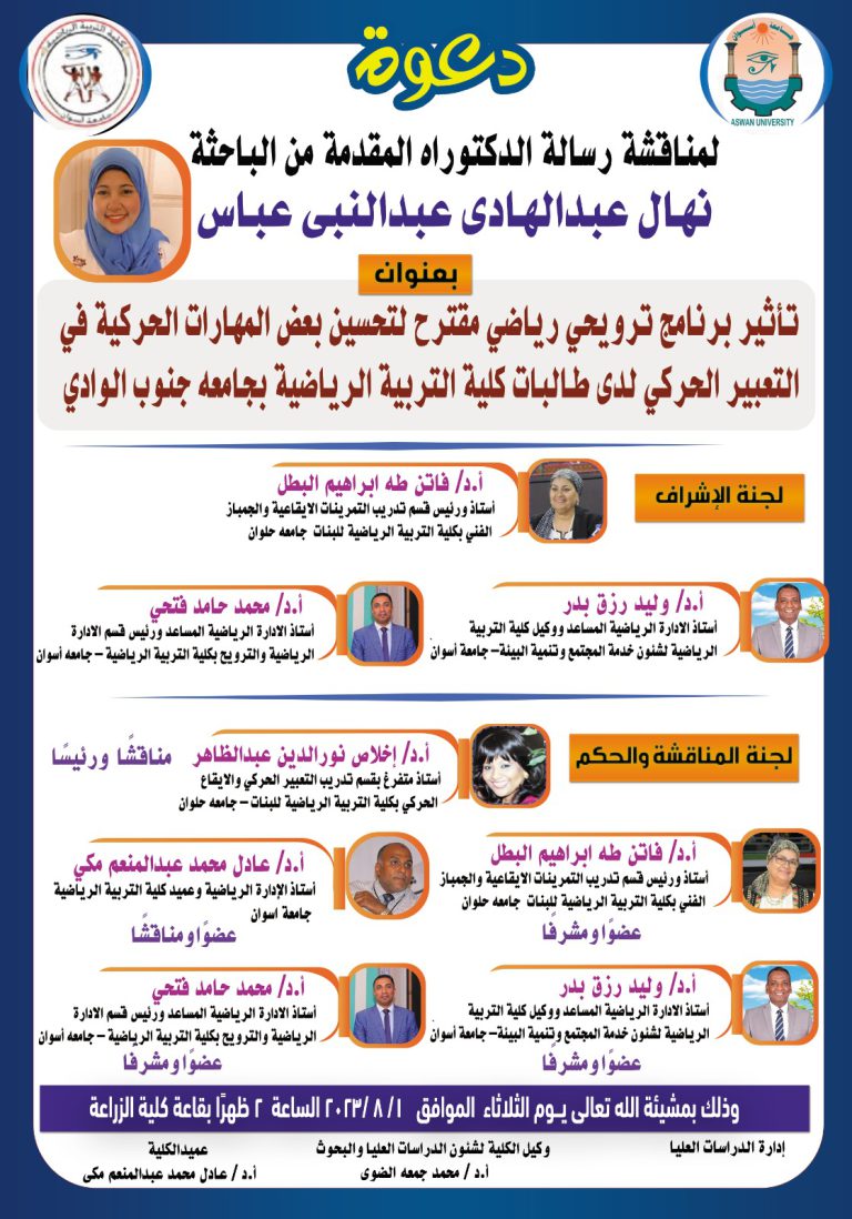 سيتم مناقشة رسالة الماجستير المقدمة من الباحثة /نهال عبدالهادى عبدالنبى بعنوان ” تأثير برنامج ترويحى رياضى مقترح لتحسين بعض...