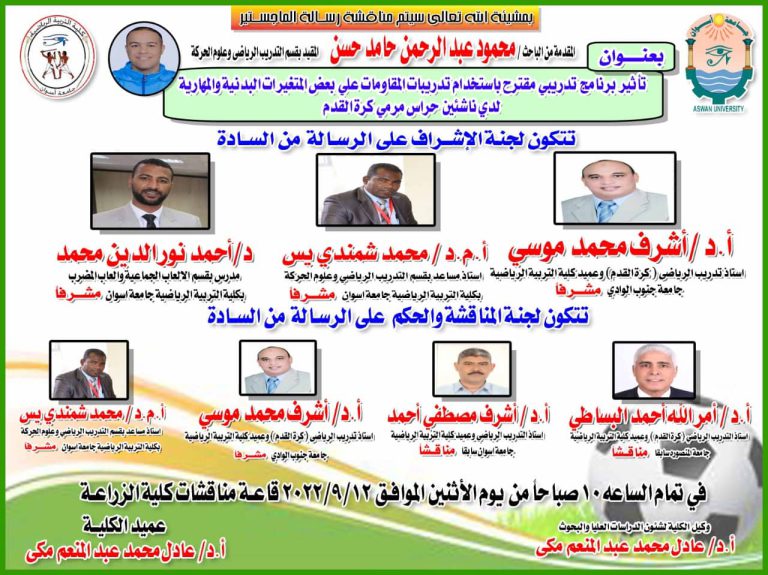 سيتم مناقشة رسالة الماجستير المقدمة من الباحث /محمود عبدالرحمن حامد بعنوان ” تأثير برنامج تدريبى بإستخدام تدريبات المقاومات على...