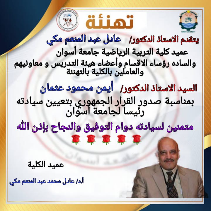 يتقدم السيد الدكتور /عادل مكى عميد كلية التربية الرياضية ورؤساء الأقسام وأعضاء هيئة التدريس والهيئة المعاونة وجميع العاملين بالكلية...