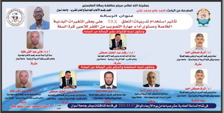 سيتم مناقشة الماجستير المقدمة من الباحث /أحمد عامر محمد على بعنوان ” تأثيرأستخدام تدريبات التعلق T R X على بعض...