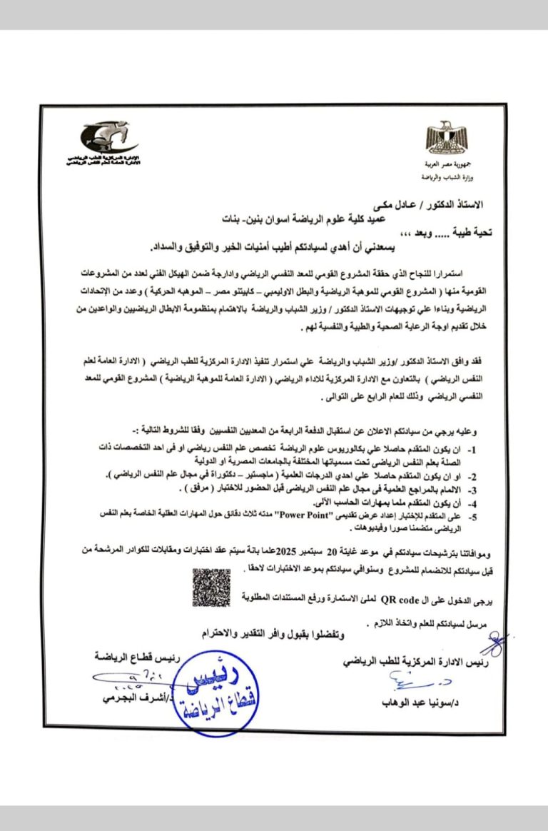 وزارة الشباب والرياضة تعلن عن بدء استقبال دفعة جديدة من المتدربين بدبلومة الطب النفسي الرياضي أعلنت وزارة الشباب والرياضة –...