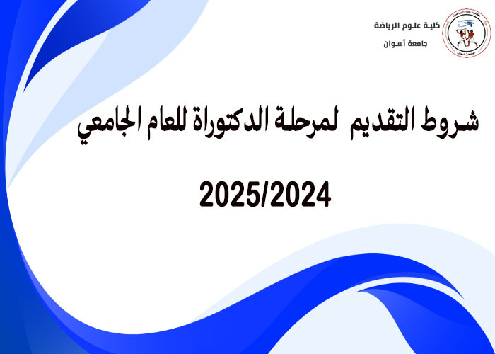 تعلن كلية علوم الرياضة عن بدء التقديم للدراسات العليا المرحلة الدكتوراه للعام الجامعي ٢٠٢٥/٢٠٢٤ في الفترة من : ٢٠٢٥/١/٢ الى...
