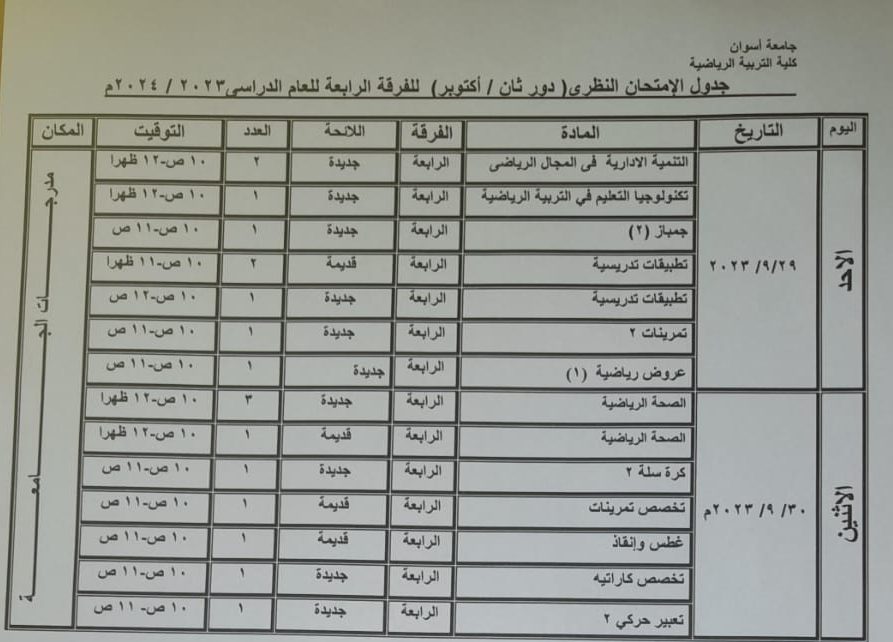جدول الامتحانات النظرى دور ثانى أكتوبر الفرقة الرابعة للعام الدراسي 2024/2023