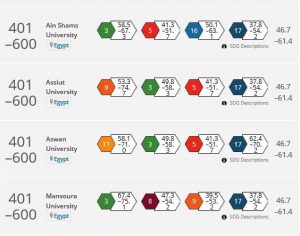 حققت نشاط متميز في أهداف التنمية المستدامة والتى تبلغ 17 هدفًا، وقد تم اختيارهم ضمن أكثر من 85 دولة، موضحاً أن جامعتى الإسكندرية وبنها قد شغلتا المرتبة 101–200 كأول الجامعات المصرية في هذا التصنيف.