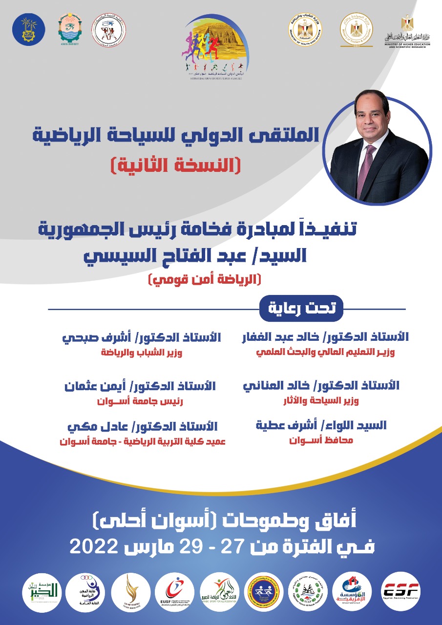 الأستاذ / خالد العناني وزير السياحة والأثار والأستاذ الدكتور / خالد العناني وزير السياحة والأثار والأستاذ الدكتور / أيمن عثمان _ رئيس جامعة أسوان و السيد اللواء / أشرف عطية _ محافظ أسوان الأستاذ الدكتور / عادل محمد عبدالمنعم مكي _عميد كلية التربية الرياضية جامعة أسوان ، آفاق وطموحات (أسوان أحلى) في الفترة من 27 – 29 مارس 2022