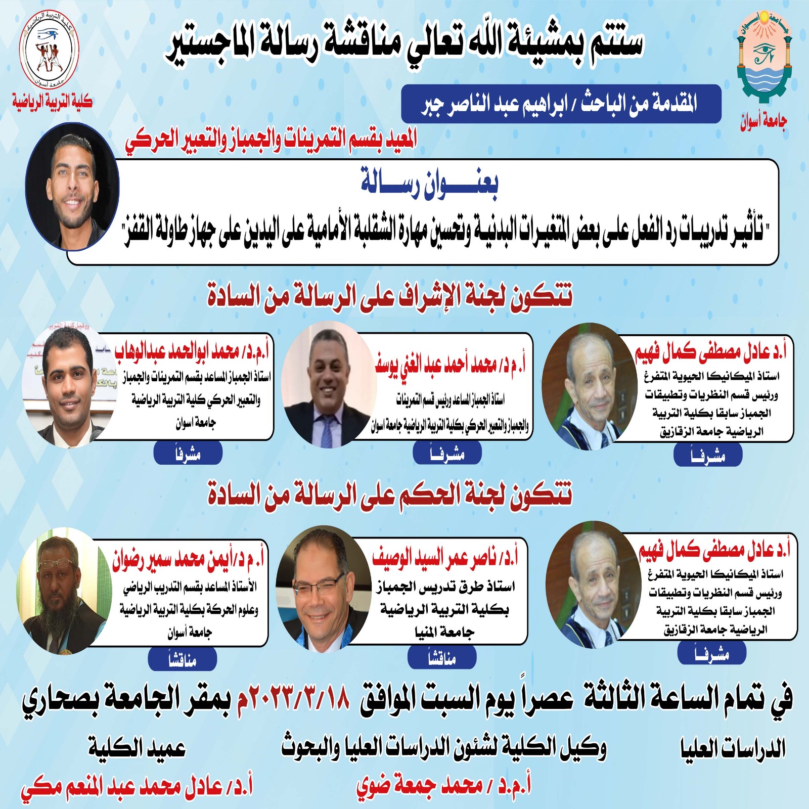 أ.م.د /محمد أحمد عبدالغنى يوسف            أستاذ الجمباز المساعد ورئيس قسم التمرينات والجمباز والتعبير الحركى بكلية التربية الرياضية _جامعة أسوان (مشرفُا)