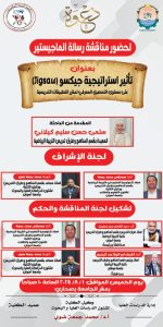 سيتم مناقشة رسالة الماجستير المقدمة من الباحثة /سلمى حسن سليم بعنوان ”تأثير استراتيجية جيسكو (Jigsaw) على مستوى التحصيل المعرفى لمقرر التطبيقات التدريسية ”