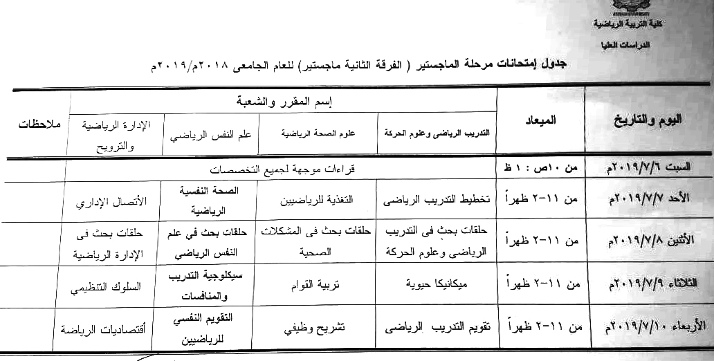 جدول إمتحانات الدراسات العليا للماجستير للفصل الدراسى الثانى للعام الجامعى 2018 / 2019