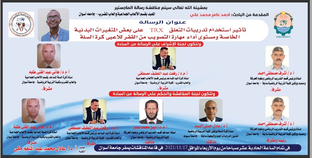 سيتم مناقشة الماجستير المقدمة من الباحث /أحمد عامر محمد على بعنوان ” تأثيرأستخدام تدريبات التعلق T R X على بعض المتغيرات البدنية الخاصة ومستوى أداء مهارة التصويب من القفر للاعبى كرة السلة “