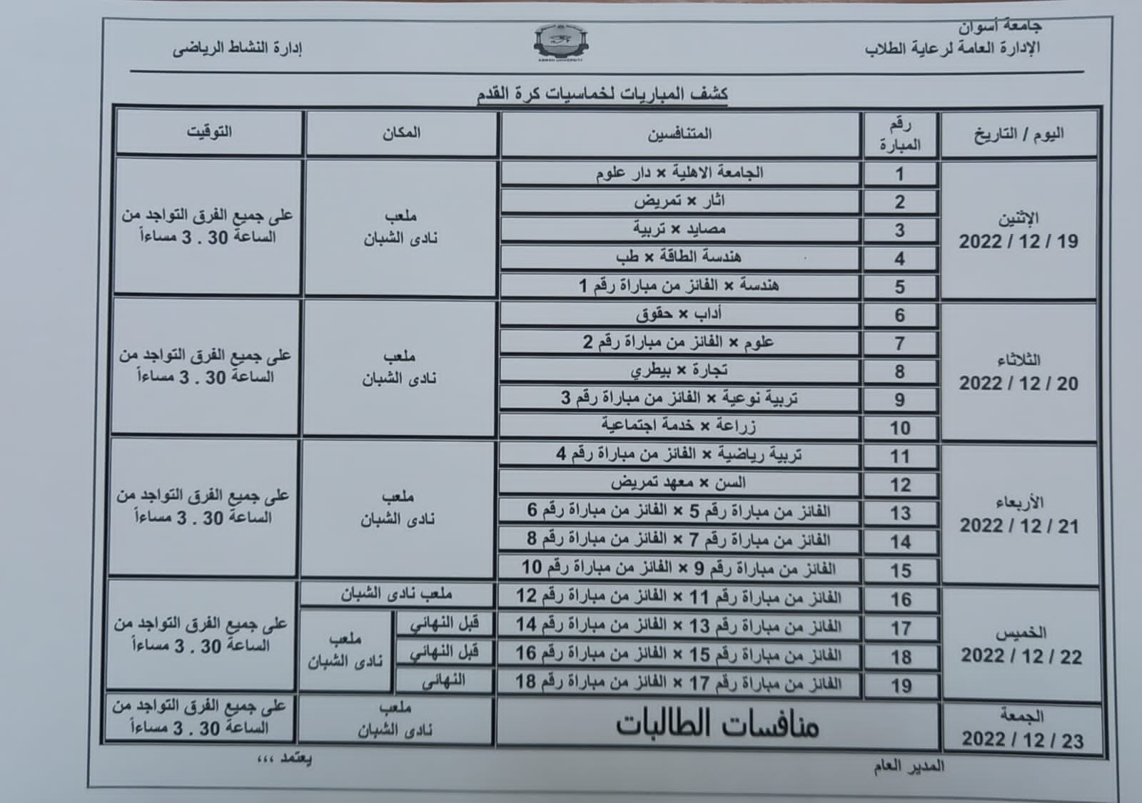 تحت رعاية السيد الأستاذ الدكتور/أيمن محمود عثمان -رئيس الجامعة والسيد الأستاذ الدكتور/لؤي سعد الدين -نائب رئيس الجامعة لشئون التعليم والطلاب يعلن إتحاد طلاب جامعة أسوان عن طريق اللجنة الرياضية العليا بالتعاون مع الإدارة المركزية بالنشاط الرياضي عن إقامة دوري كرة قدم خماسي وعلي من يرغب بالاشتراك التواصل مع أمين وأمين مساعد اللجنة الرياضية بكل كلية.