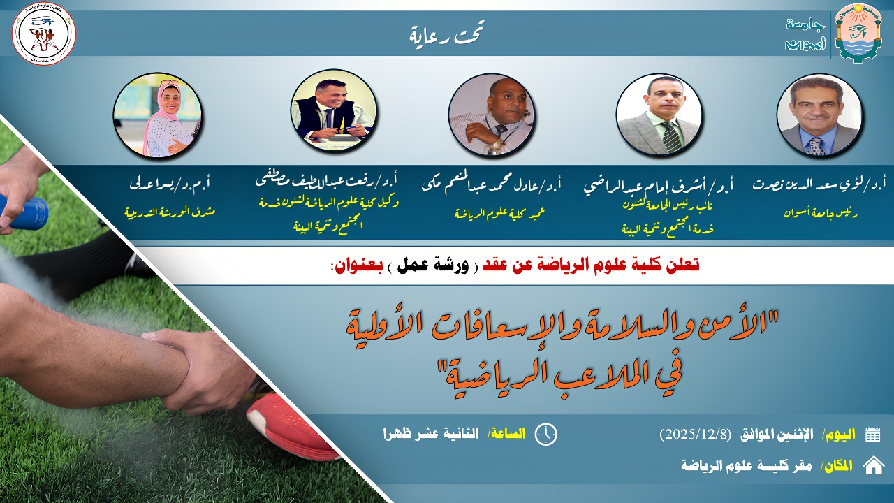 تعلن كلية علوم الرياضة عن تنظيم ورشة تدريب مميزة تهدف إلى رفع وعي الطلاب بأساسيات الأمن والسلامة والإسعافات الأولية داخل الملاعب والتعامل السليم مع الإصابات والحالات الطارئة،وذلك تحت رعايةالأستاذ الدكتور/ لؤي سعد الدين نصرت – رئيس جامعة أسوان والأستاذ الدكتور/ أشرف إمام عبدالرضى _نائب رئيس الجامعة لشئون خدمة المجتمع وتنمية البيئة_ الأستاذ الدكتور/ عادل محمد مكي – عميد كلية علوم الرياضة _ الأستاذ الدكتور/ رفعت عبداللطيف – وكيل الكلية لشئون خدمة المجتمع وتنمية البيئة _ الأستاذ الدكتور/ يسرا عدلي _ مشرف الورشة التدريبية . ، وذلك يوم الاثنين الموافق 8 ديسمبر 2025 فى تمام الساعة الثانية عشر ظهرًا بمقر كلية علوم الرياضة