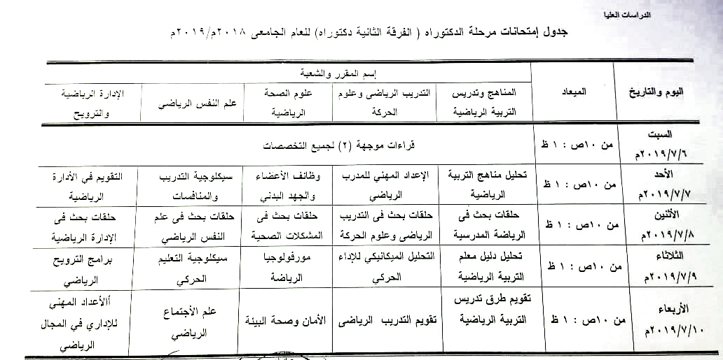 • جدول امتحانات مرحلة الدكتوراه للدراسات العليا للعام الجامعى (الترم الثانى) 2018 / 2019 .