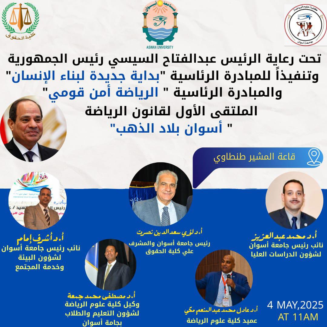في إطار تنفيذ مبادرات فخامة رئيس الجمهورية الرئيس عبدالفتاح السيسي رئيس الجمهورية “بداية جديدة لبناء الإنسان” و “الرياضة أمن قومي”، وتحت رعاية الأستاذ الدكتور لؤي سعد الدين نصرت، رئيس جامعة أسوان ،والدكتور عادل محمد عبد المنعم مكي، عميد كلية علوم الرياضة، تُعلن جامعة أسوان عن تنظيم الملتقى الأول للقانون الرياضي، بالتعاون المشترك بين كليتي علوم الرياضة والحقوق، وذلك يوم الأحد 4 مايو في تمام الساعة 11 صباحًا، بقاعة المشير طنطاوي داخل الحرم الجامعي.