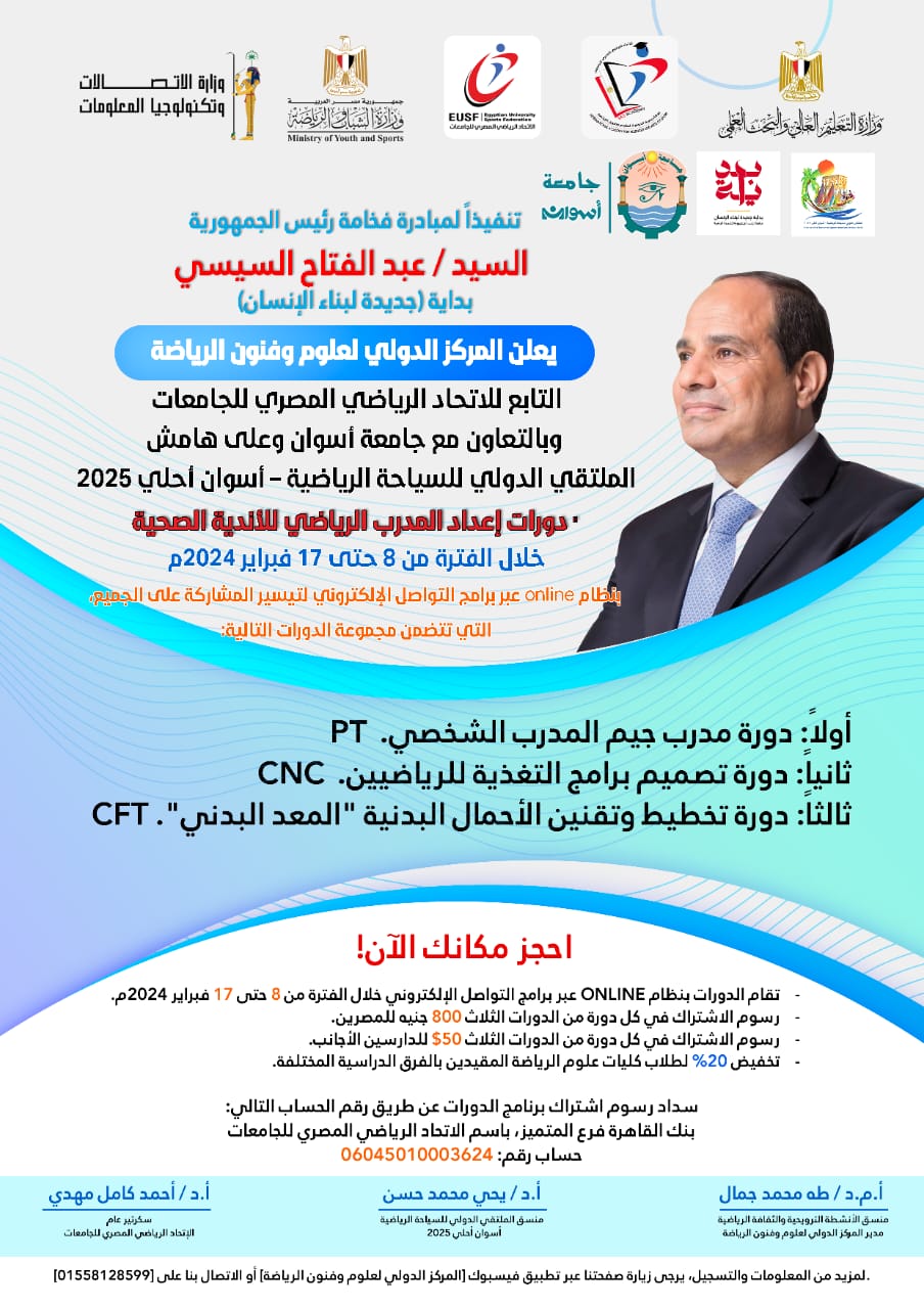 يعلن المركز الدولي لعلوم وفنون الرياضة التابع للإتحاد الرياضي المصري للجامعات وبالتعاون مع جامعة أسوان وعلى هامش الملتقي الدولي للسياحة الرياضية – أسوان أحلي 2025 عن :